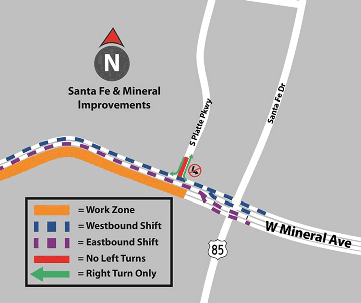 - Southbound Platte River Parkway at Mineral Avenue will be reduced to a single right turn lane onto westbound Mineral Avenue. No left turns will be permitted.